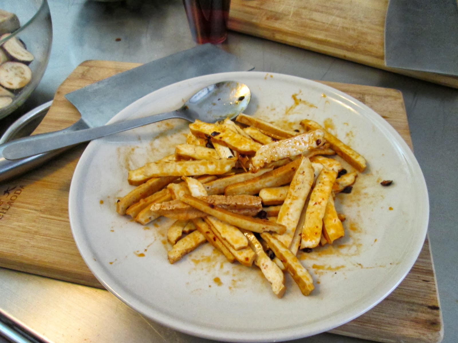 Our first dish, a bean curd (tofu) spicy salad. I haven't eaten very much tofu but I didn't mind this too much, just too spicy for my tastes (even though I made it myself). |